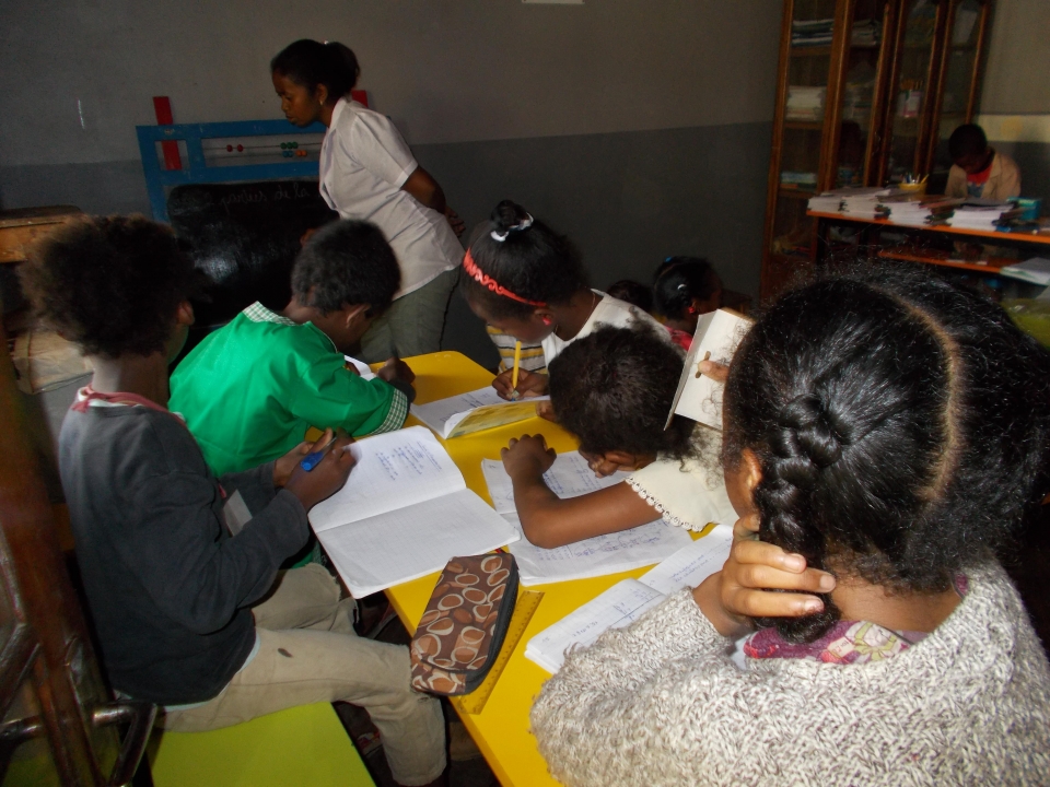 Nella foto in basso: bambini alle prese con i compiti sotto lo sguardo di un'insegnante alla Salle d'Etude del Centre Mère Enfant (Antananarivo, Madagascar)