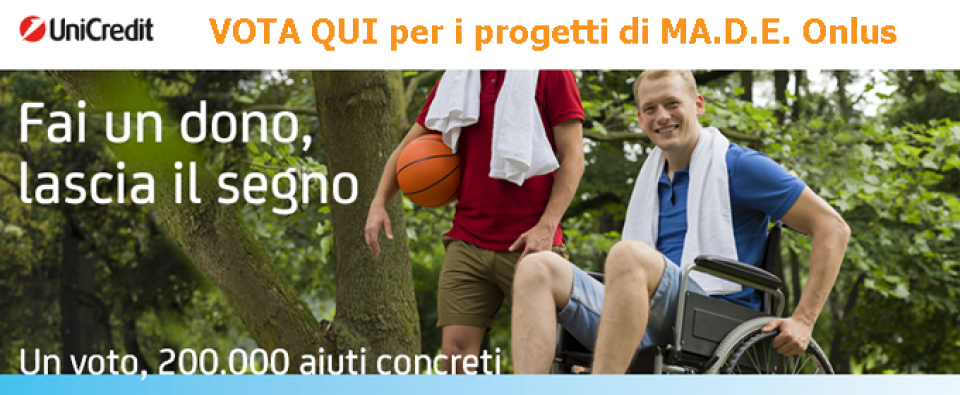 Con l'iniziativa "Un voto, 200.000 aiuti concreti", puoi aiutarci a raggiungere i 150 voti che ci consentiranno di ricevere un prezioso contributo da "IL MIO DONO", la rete di solidarietà di UniCredit Banca.