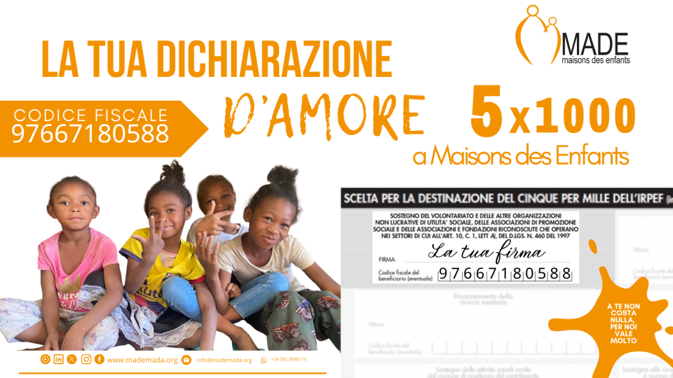 Scegliere di devolvere il 5x1000 a MADE è un’opportunità gratuita che aiuta a realizzare i nostri progetti in difesa dei diritti dei minori, di sviluppo, formazione ed inclusione.