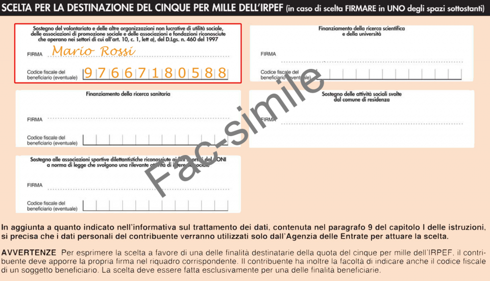 Riportalo nel primo riquadro sotto la voce “Sostegno del volontariato e delle altre organizzazioni non lucrative di utilità sociale”, e completa con la tua firma: 5 secondi per 1000 risultati.