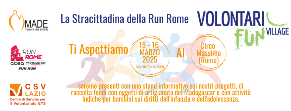 Noi di MADE ti aspettiamo Il 15 e il 16 Marzo 2025 dalle ore 10:00 alle ore 16:00 al Circo Massimo con uno stand informativo sui nostri progetti, di raccolta fondi con oggetti di artigianato del Madagascar e con attività ludiche per bambini sui diritti dell'infanzia e dell'adolescenza.