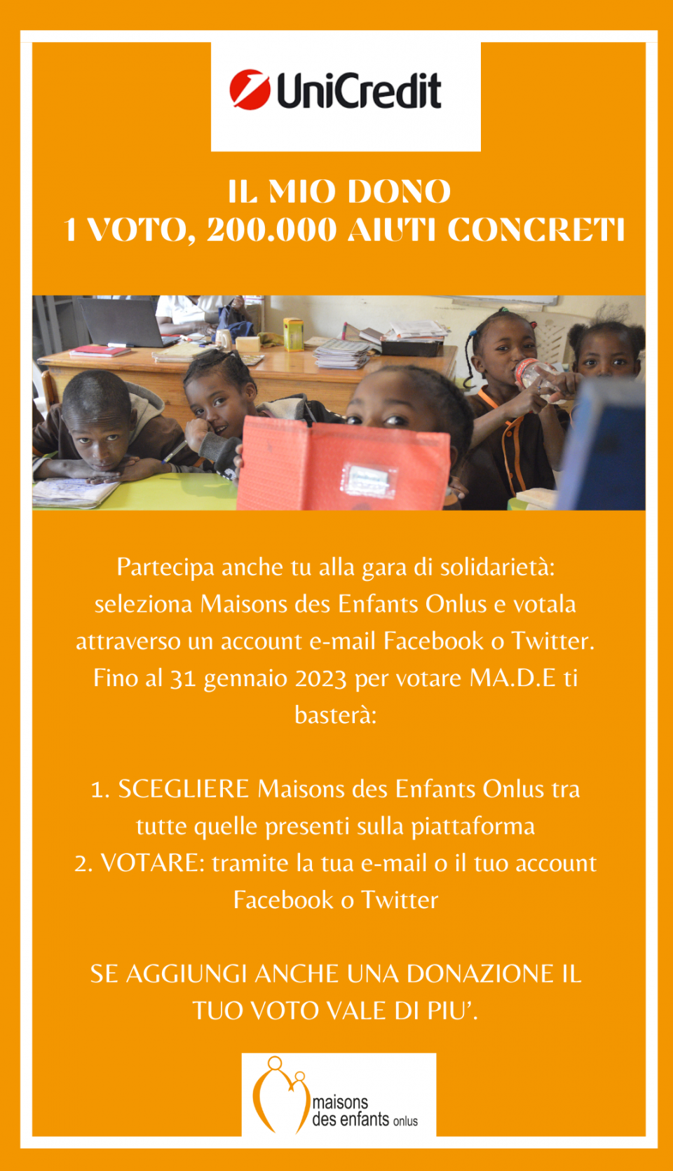 Partecipa anche tu alla gara di solidarietà: seleziona Maisons des Enfants Onlus e votala attraverso un account e-mail Facebook o Twitter.